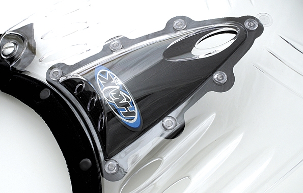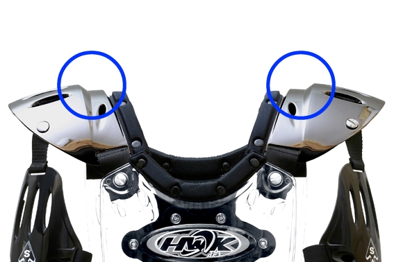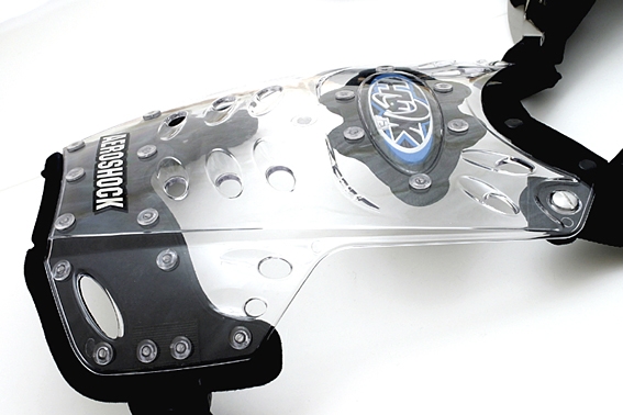 マディの後の手入れは気が重いものですが、アエロショックのフロント部はツルリと一拭きで汚れを落とせます。このイージーメンテナスはシンボルのロゴマークを内側に接合させたことによるもので、実戦での使いやすさを考慮したアイデアです。またフロントサイドの回り込みを強め、身体への密着度を増しました。