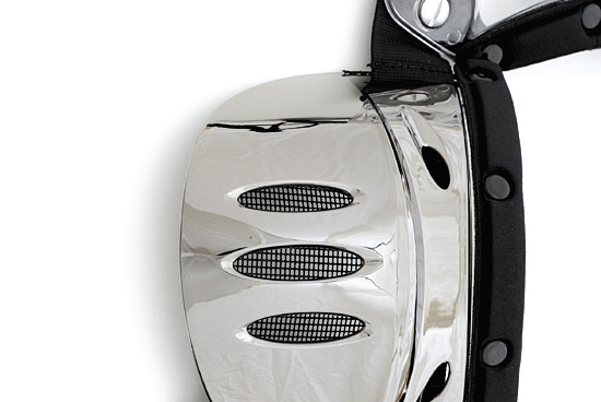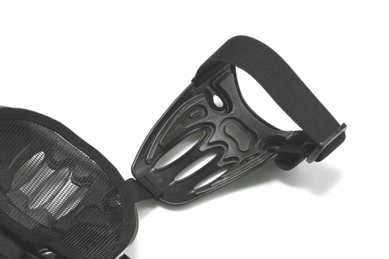 背面上部に強制ベンチレーションと脊椎エスケープを兼ねた整形加工を施しました。この半円形の突起は転倒時に身体の回転を促す働きもあり、衝撃の減衰に効果的です。